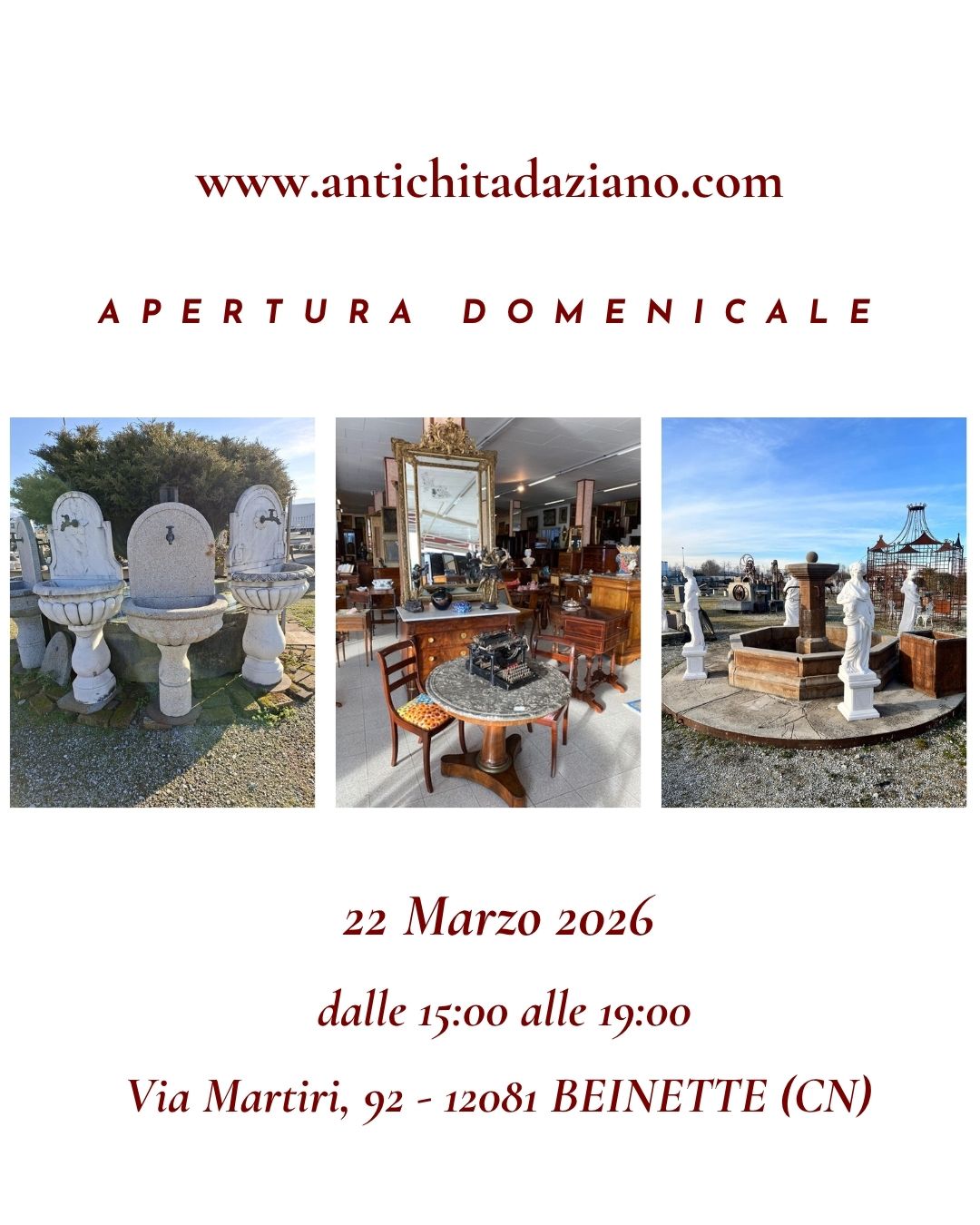 Daziano Francesco è da oltre cinquant’anni un riferimento per chi cerca mobili antichi, arredi da giardino e mezzi d’epoca. Nata negli anni ’70 come piccola bottega artigianale, l’attività è cresciuta con passione, mantenendo intatto lo spirito di una volta. Offriamo anche il noleggio di oggetti d’epoca per cinema, eventi e scenografie. Antichità Daziano guarda al futuro con rispetto per il passato, che continua a vivere in ogni oggetto.