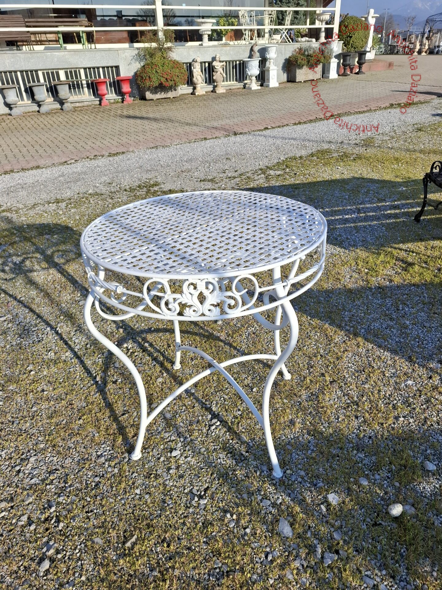 Set tavolo e sedie in ferro battuto, con piano di vetro.