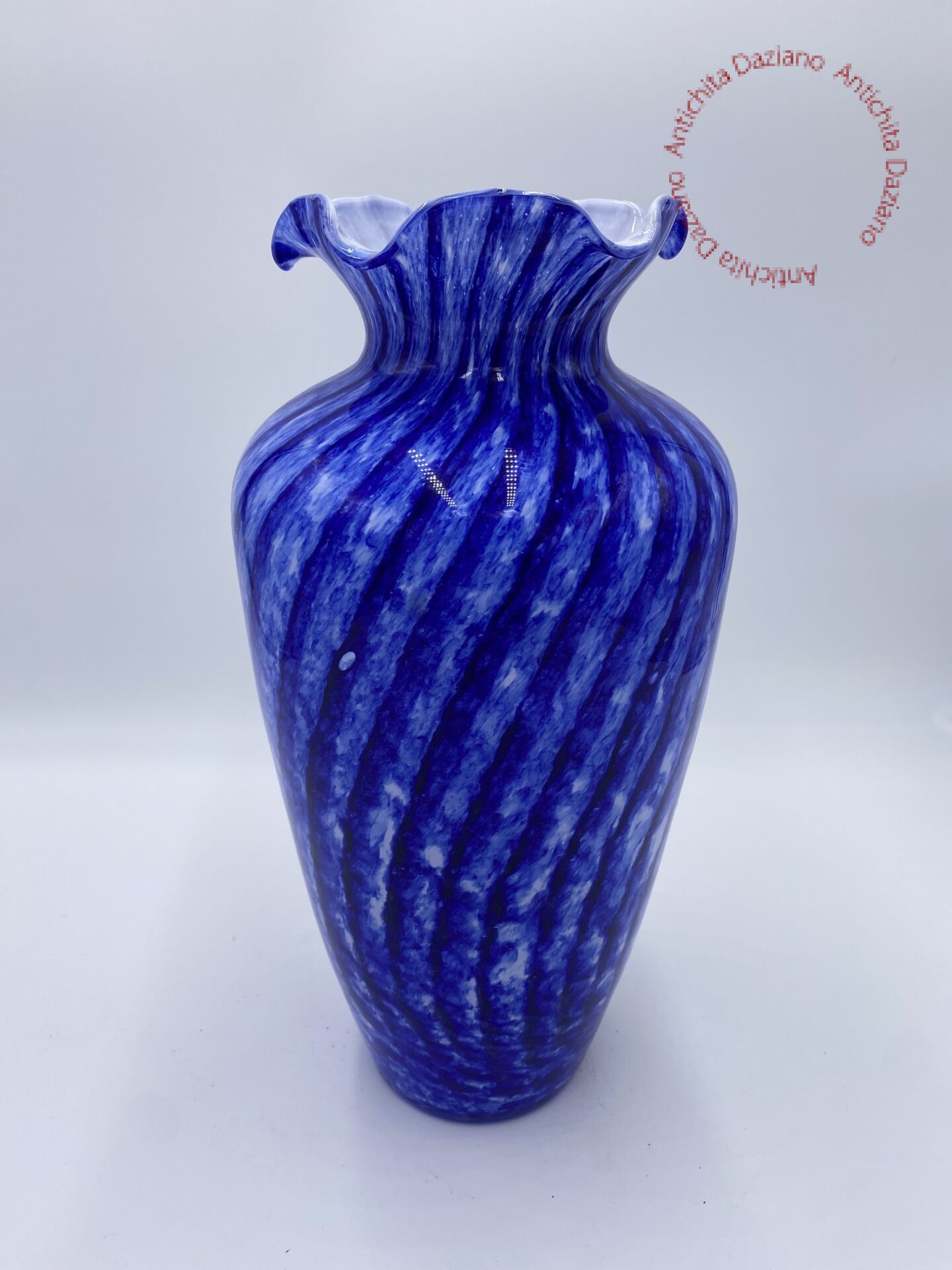 Vaso vetro motivo a spirale blu e bianco, e con bordo smerlato. Altezza 35 cm....