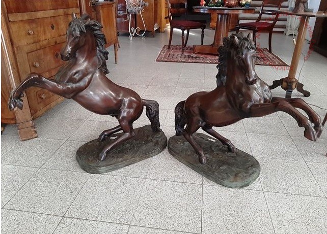 coppia di cavalli in bronzo, epoca fine '800. Dimensioni: la base misura 34 x 56...