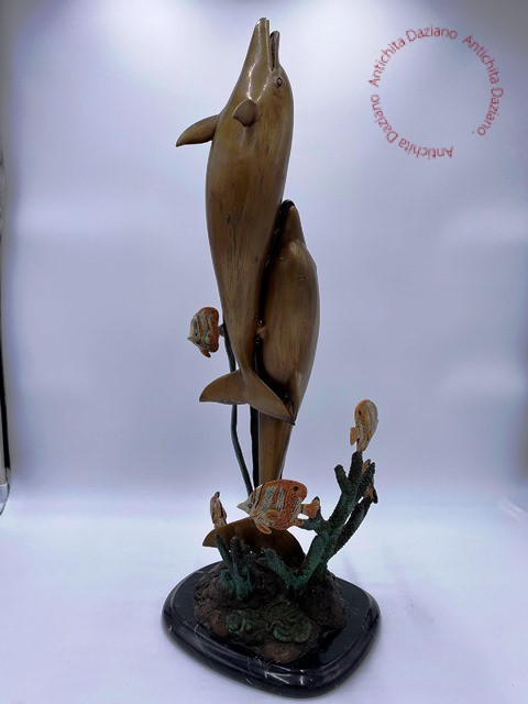 Statua in bronzo con coppia di delfini e pesci, base in marmo pregiato: arte e...