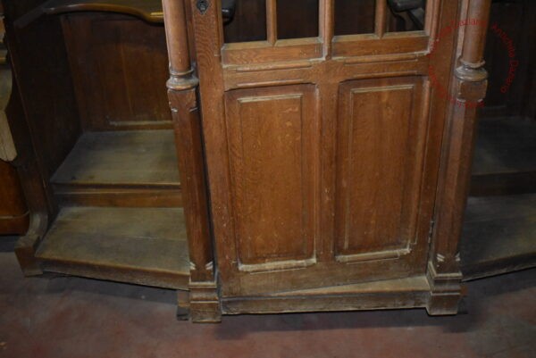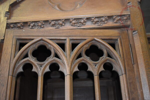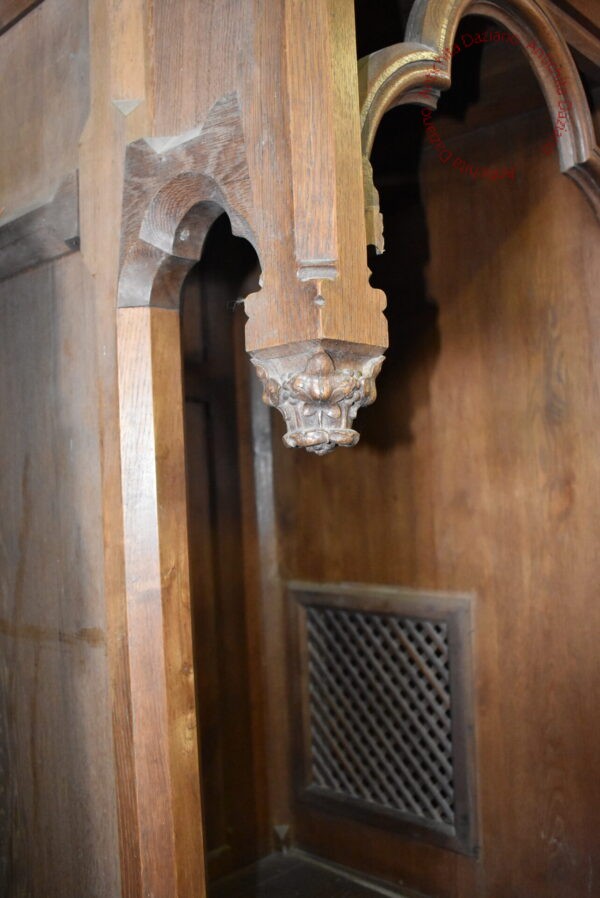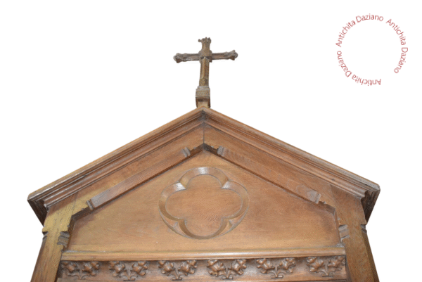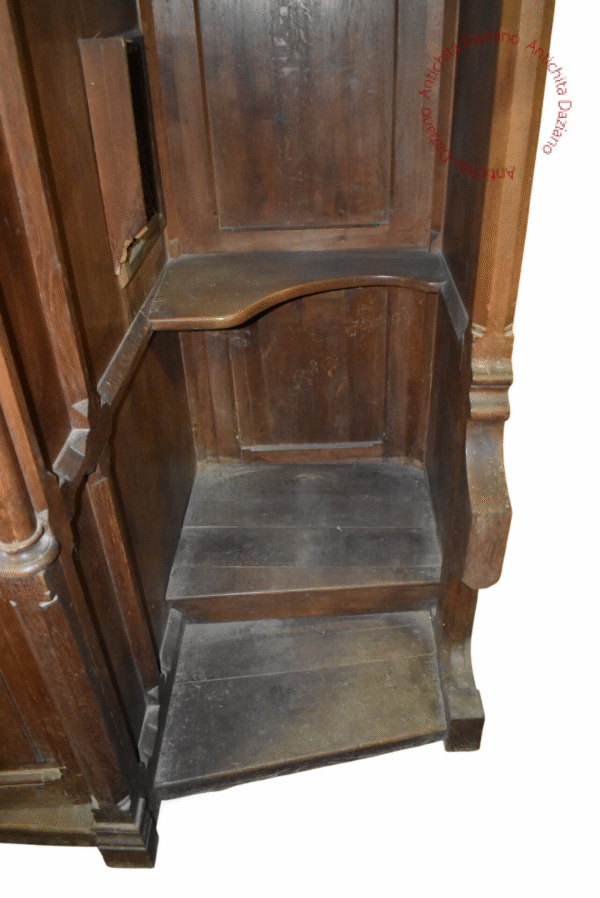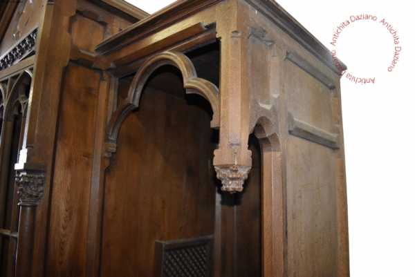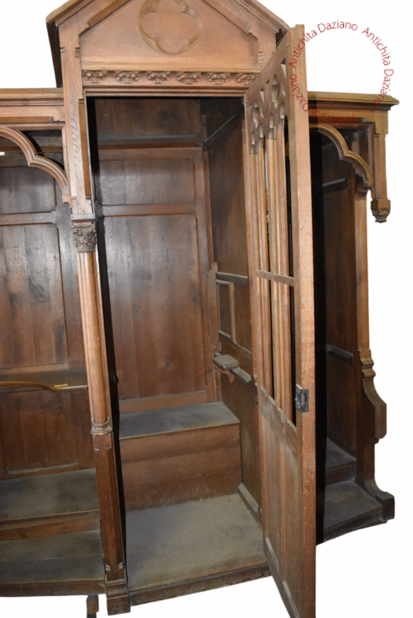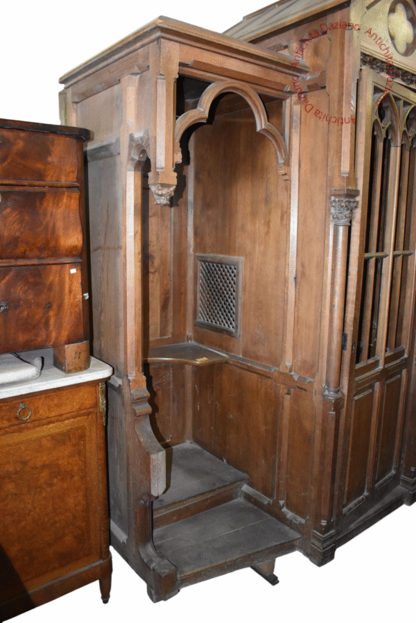 Confessionale in pregiato noce, in raffinato stile gotico, completamente smontabile. Necessita di restauro per recuperare tutto il suo splendore originale.