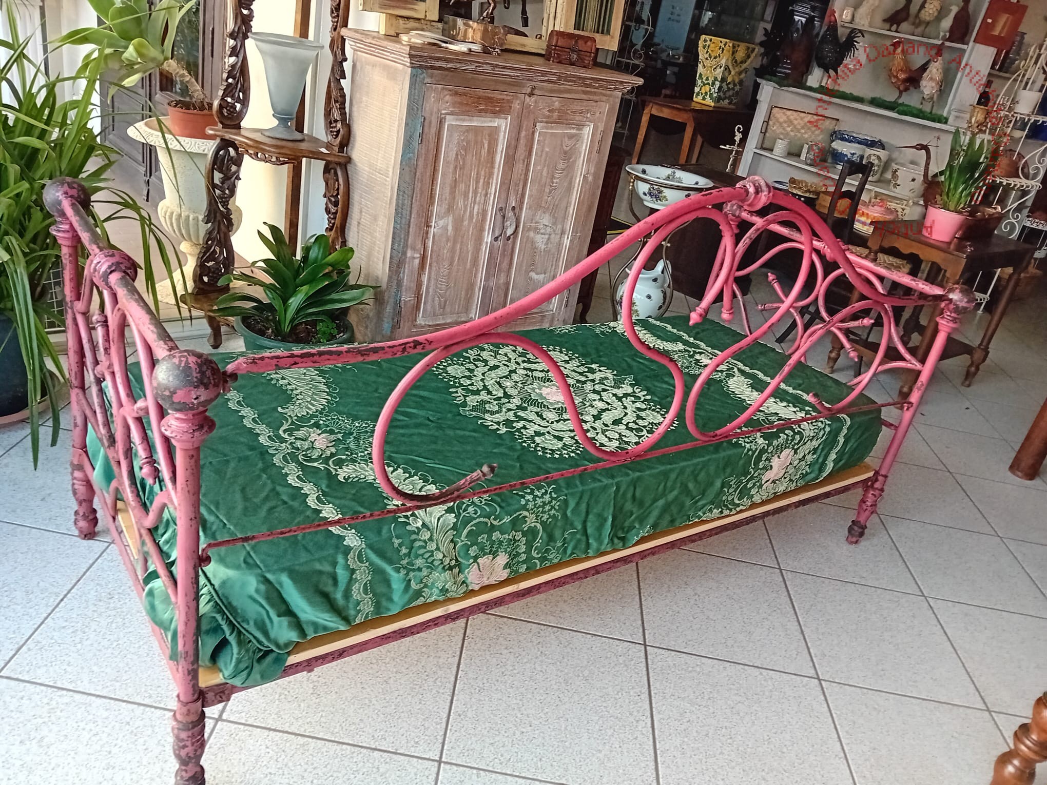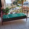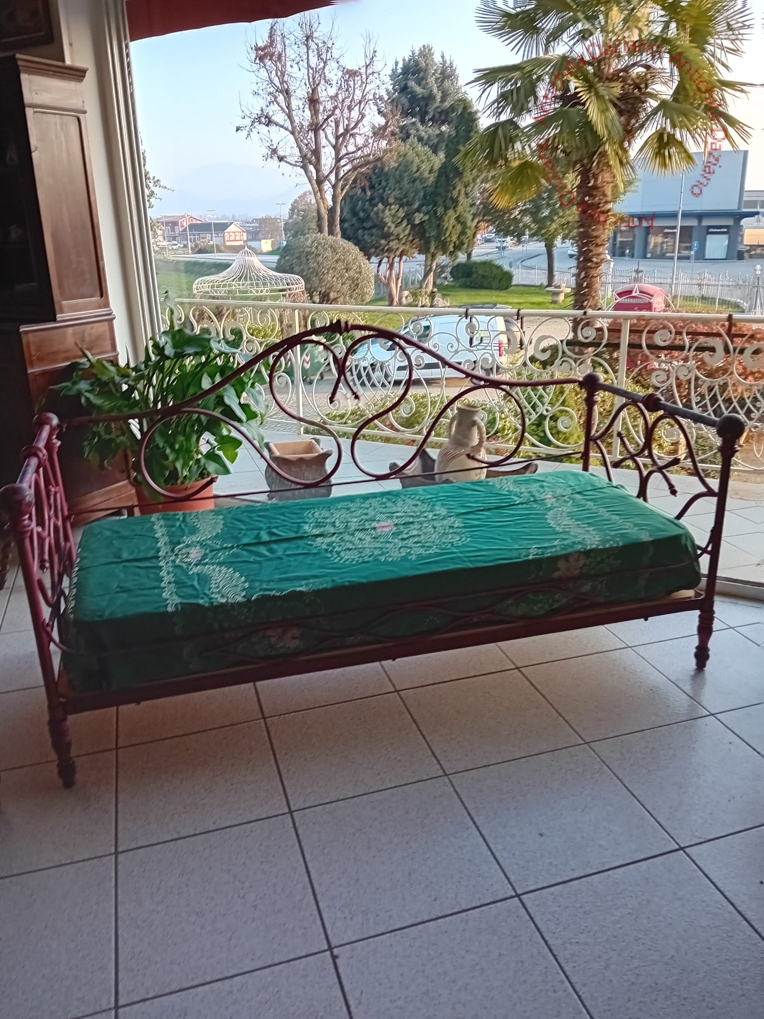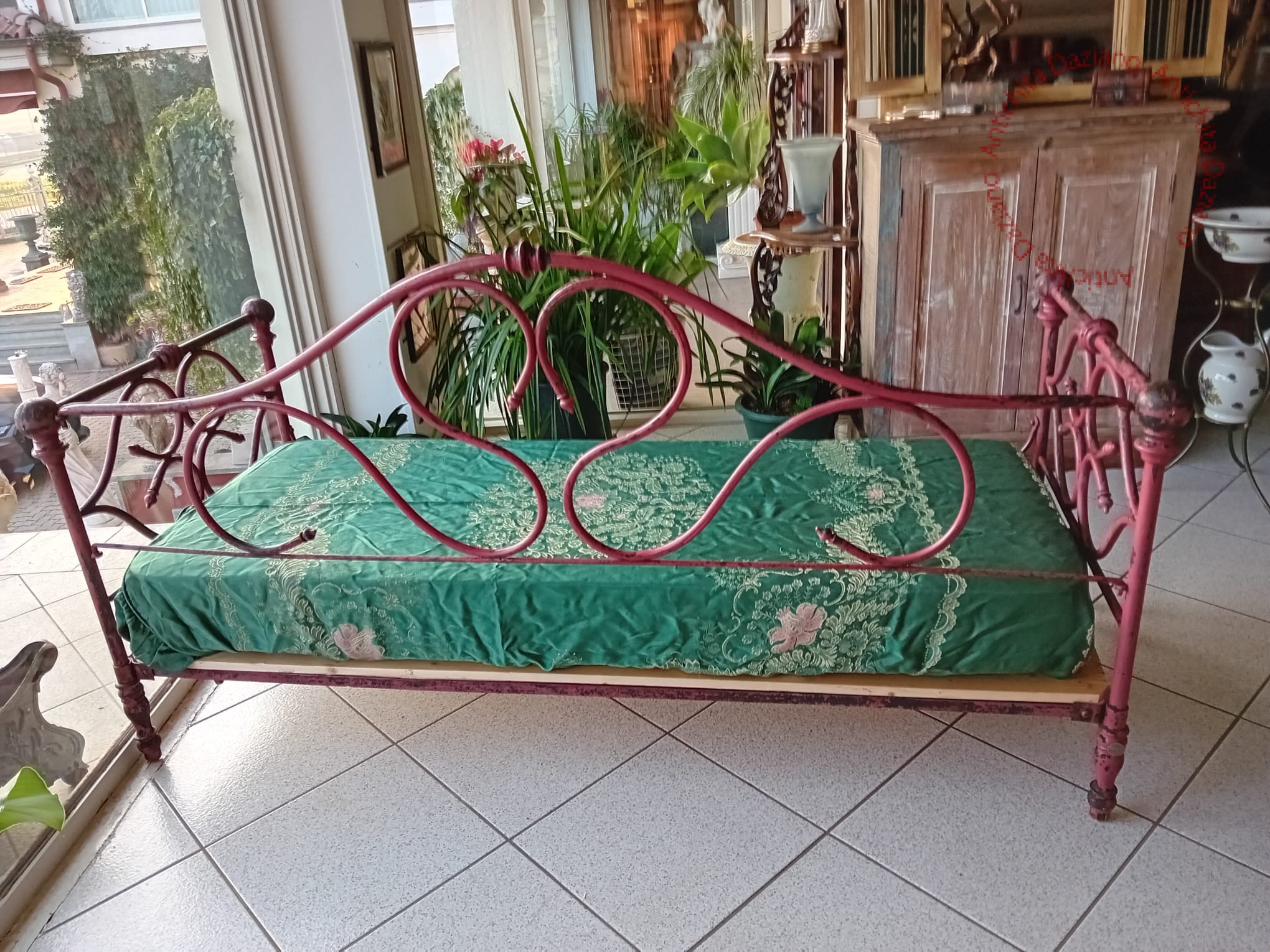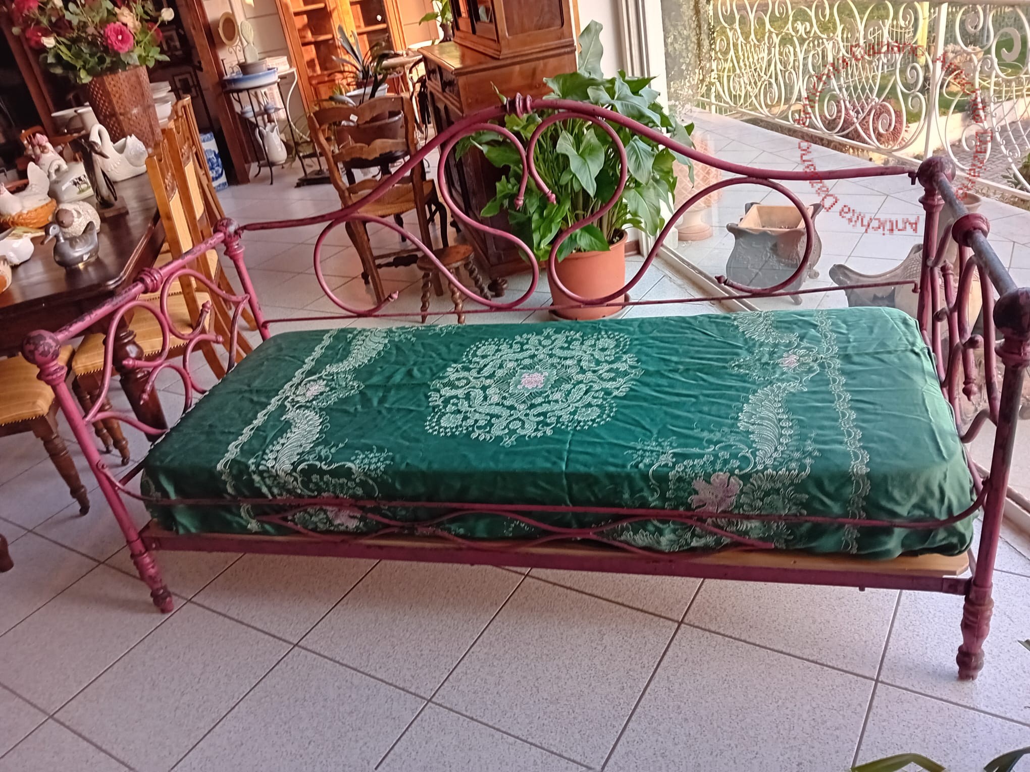 divano antico di grandi dimensioni della fine del XIX secolo. Il divano è realizzato in ferro battuto. Il ferro presenta una raffinata ed elaborata decorazione a riccioli e volute. La decorazione è presente su ogni lato, per cui è possibile posizionare il divano anche al centro della stanza per rendere visibile la bella decorazione dello schienale.