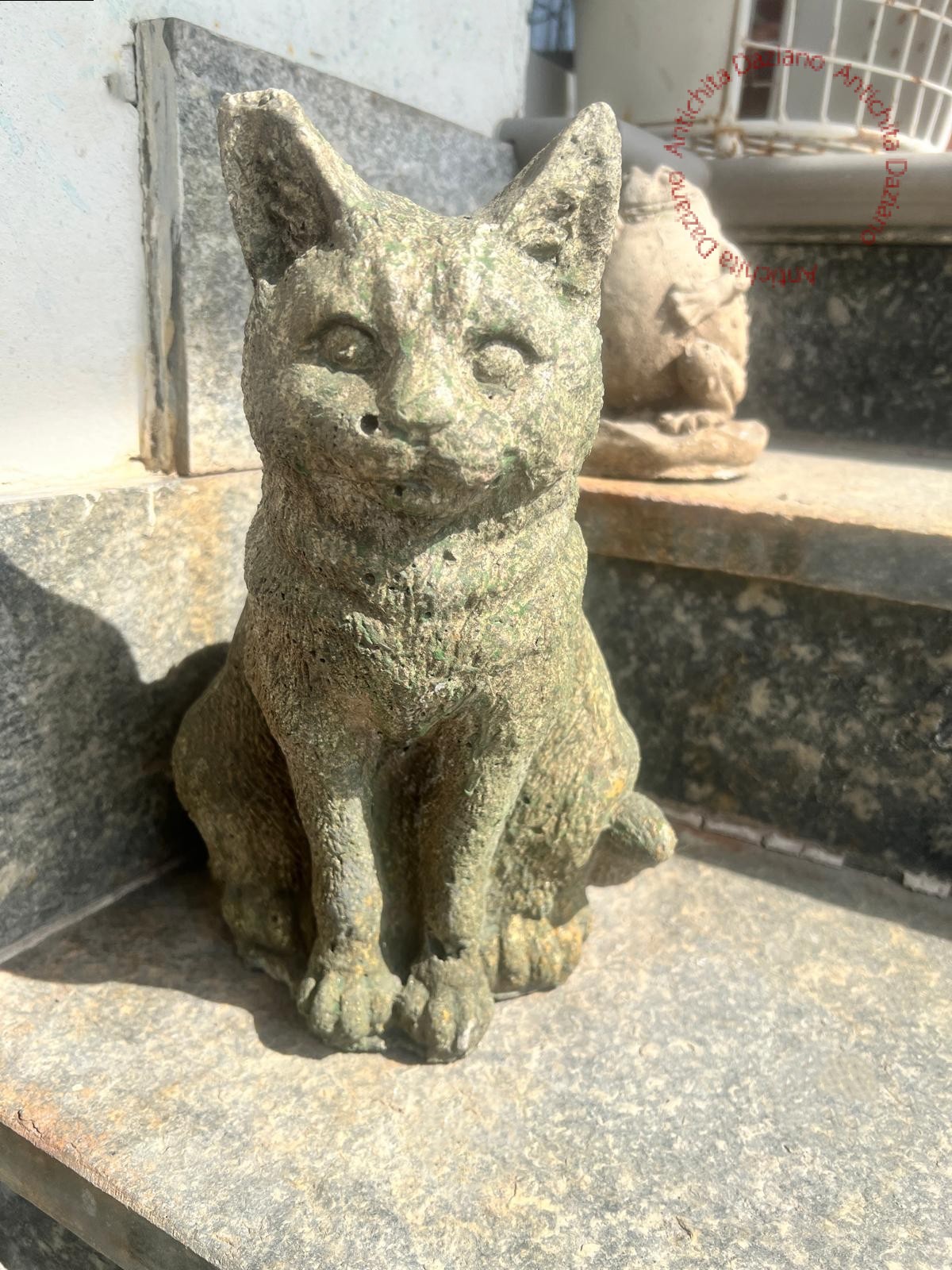 Cemento con patina naturale e tracce di muschio o licheni.