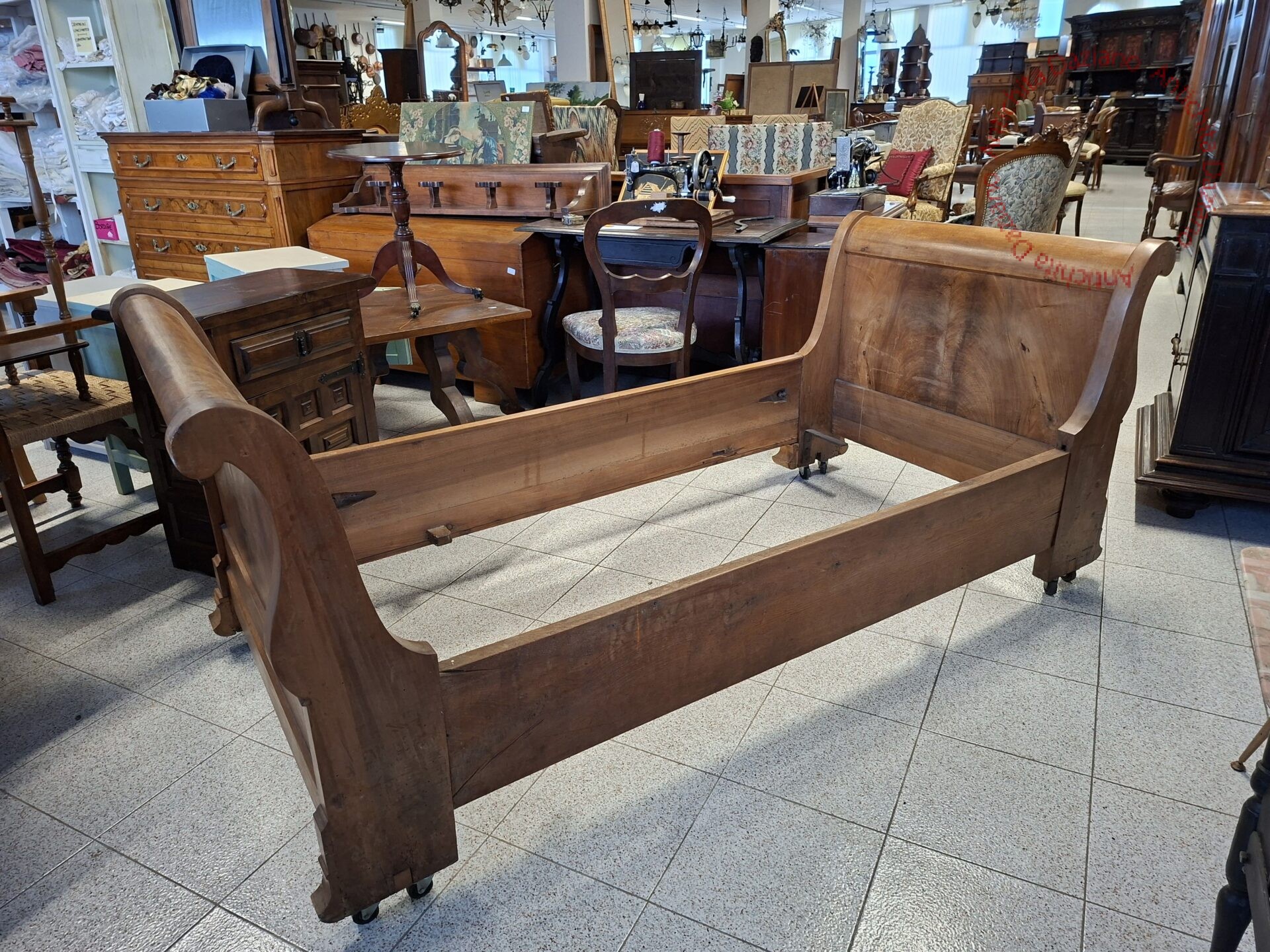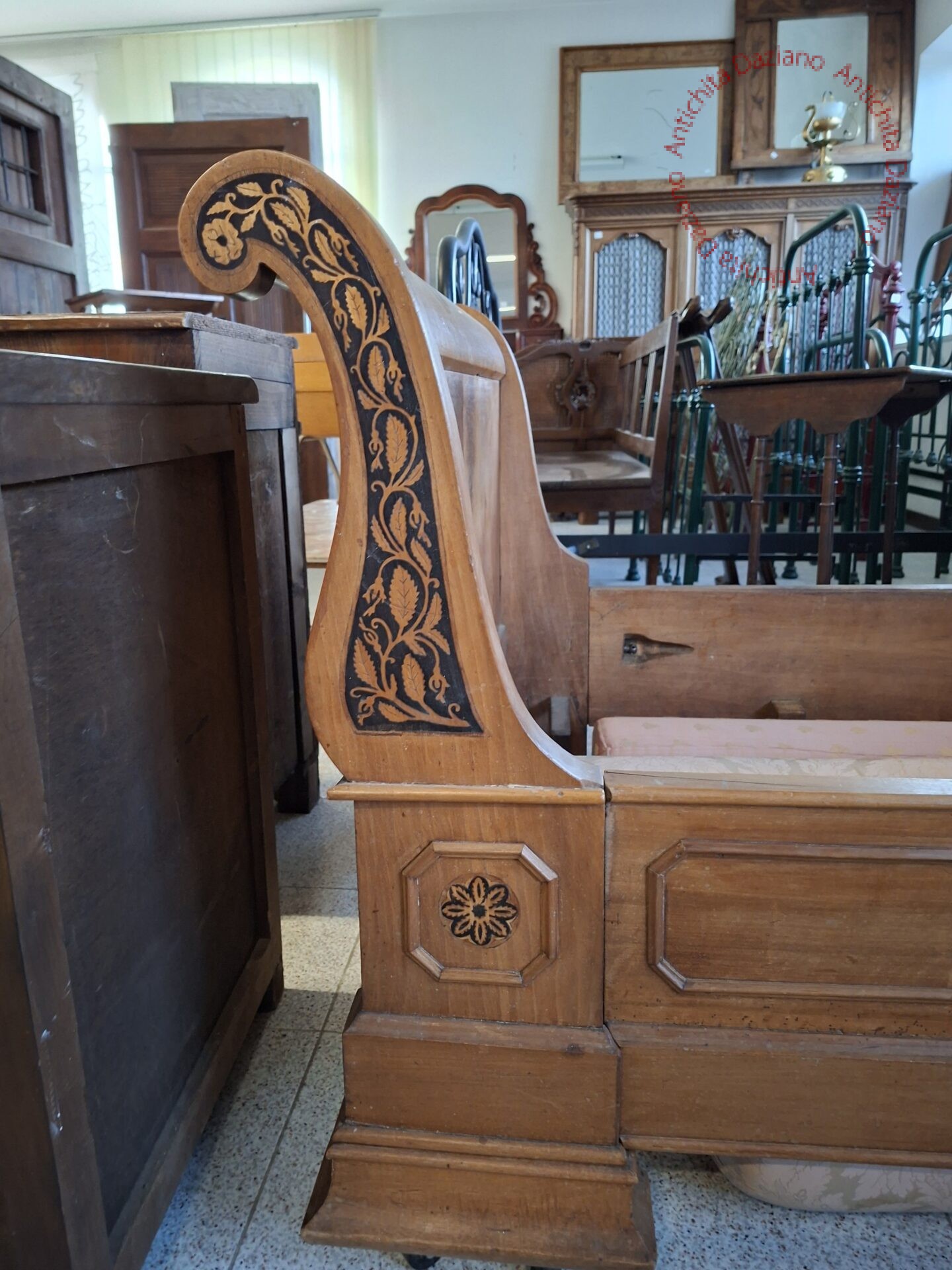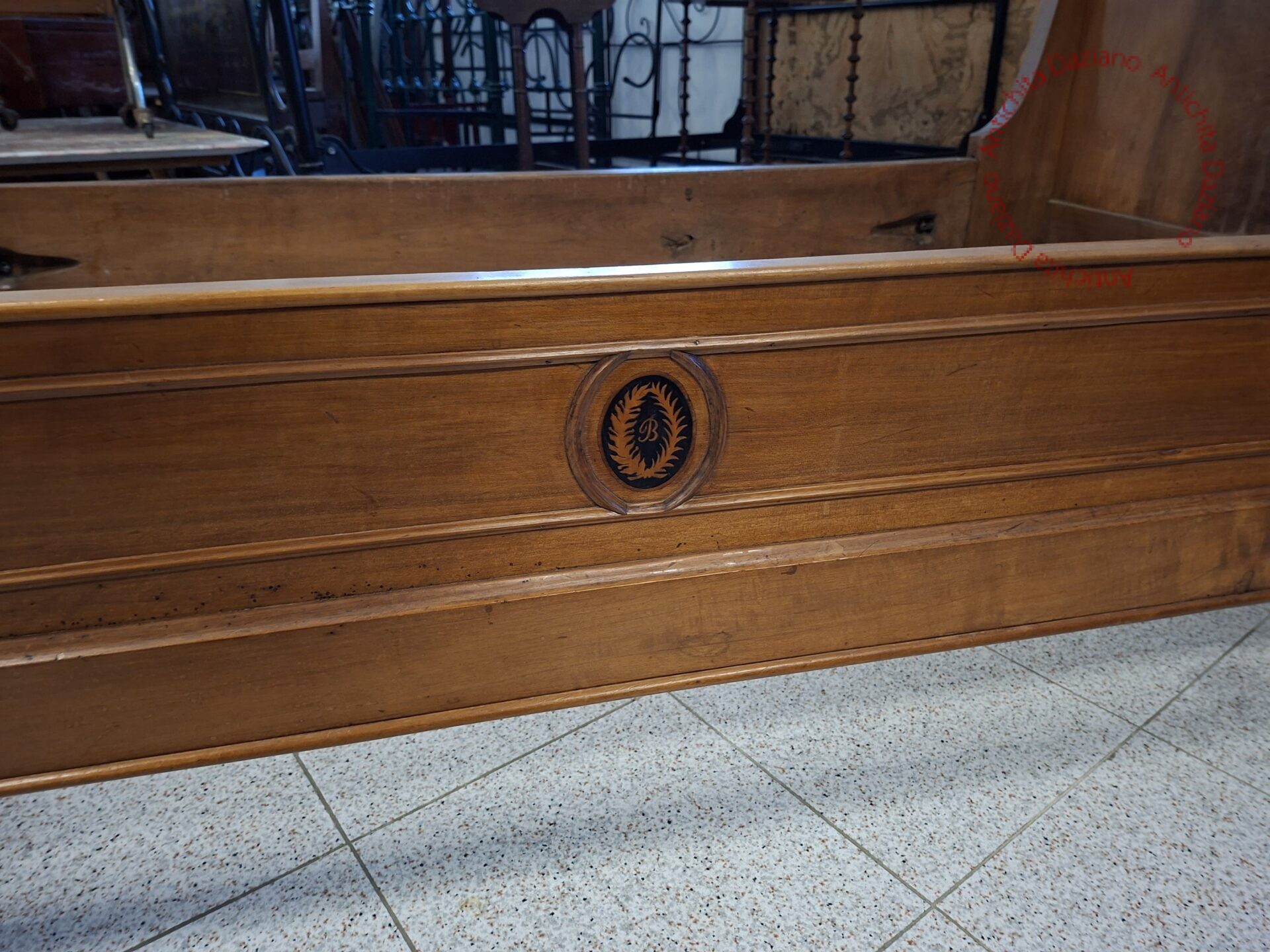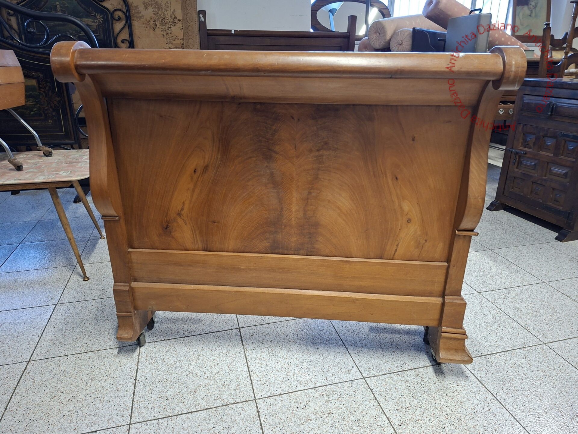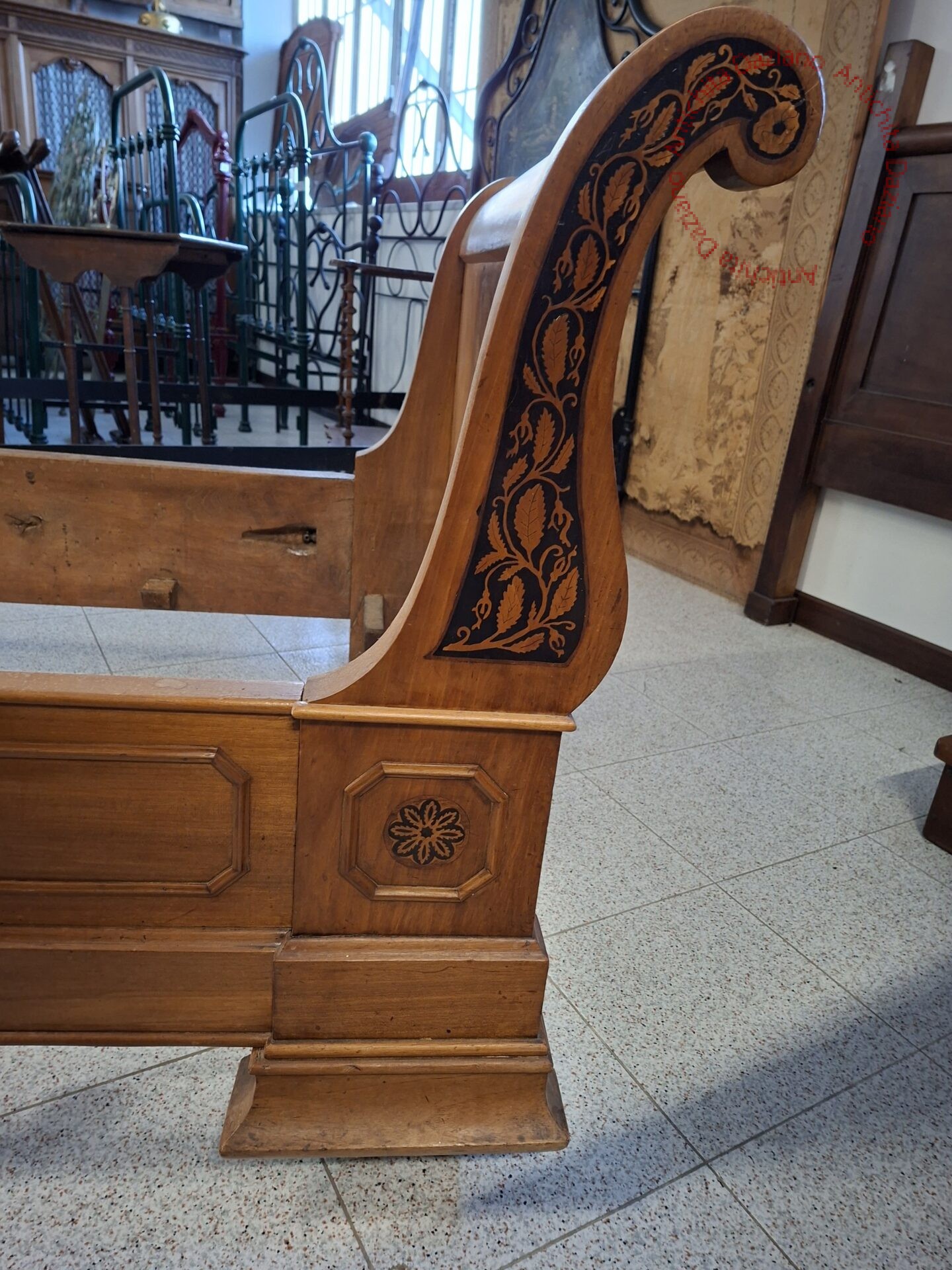 in noce, con intarsi floreali e rotelle epoca 800.