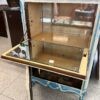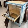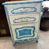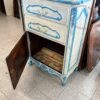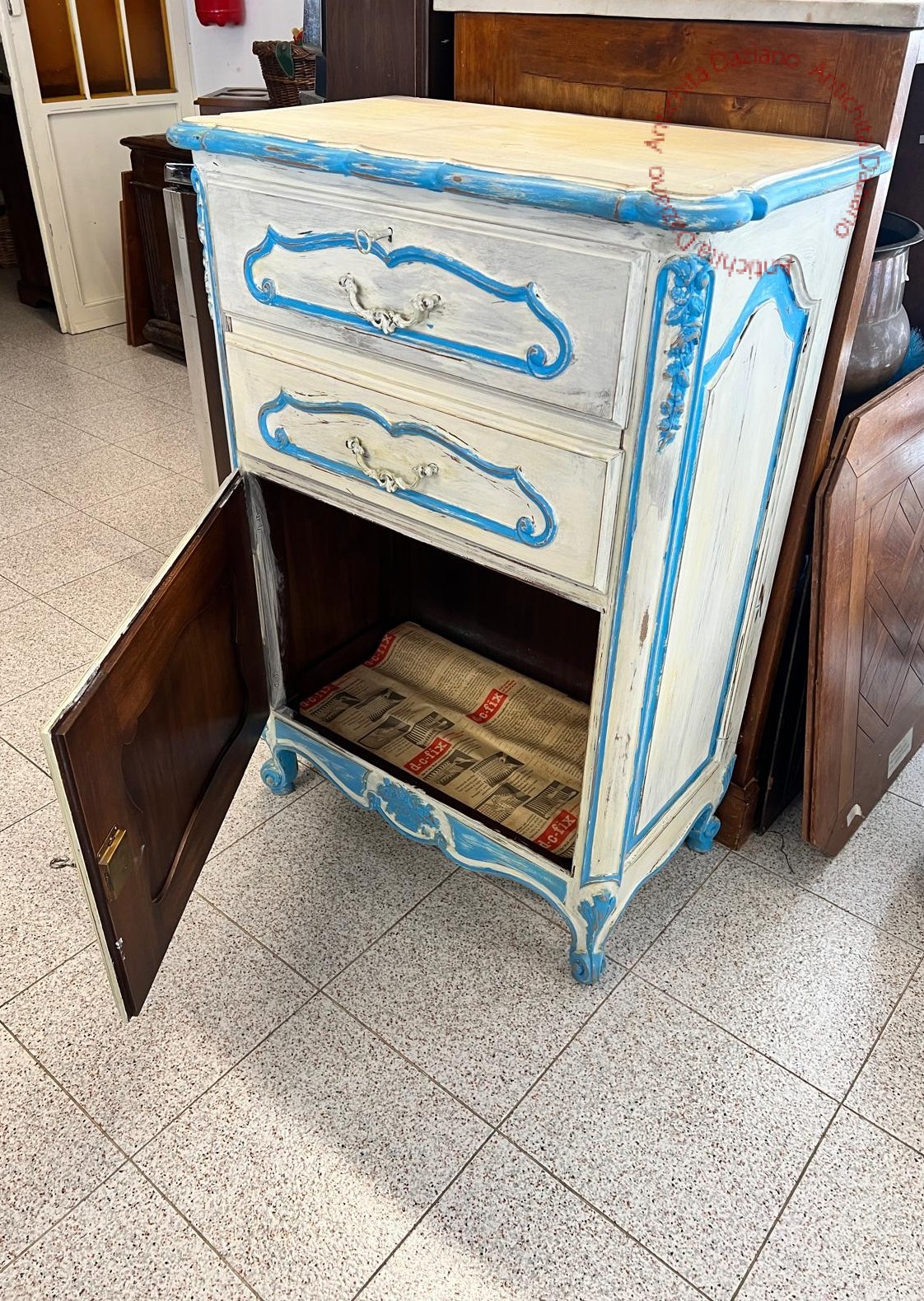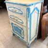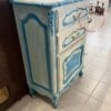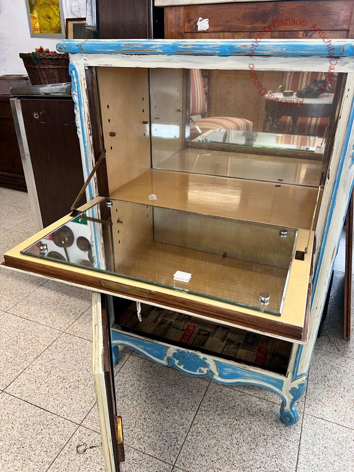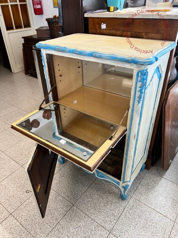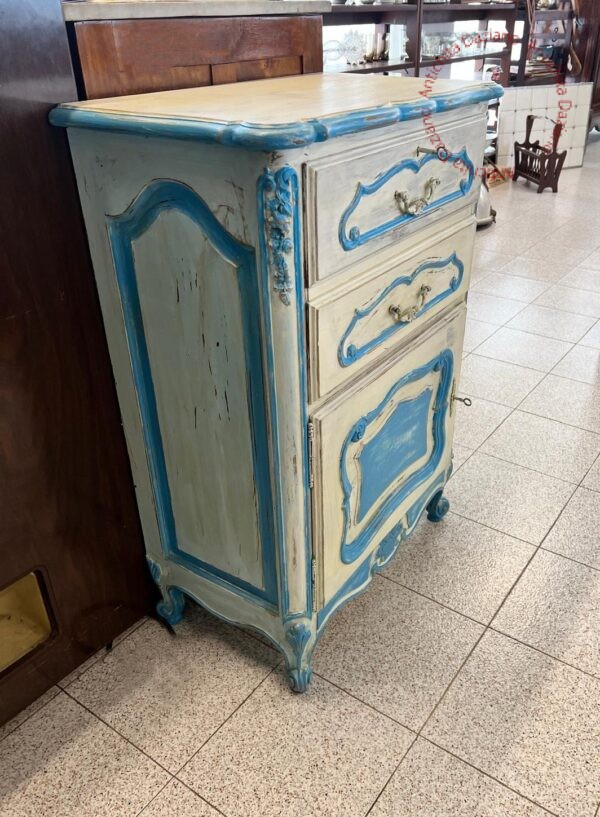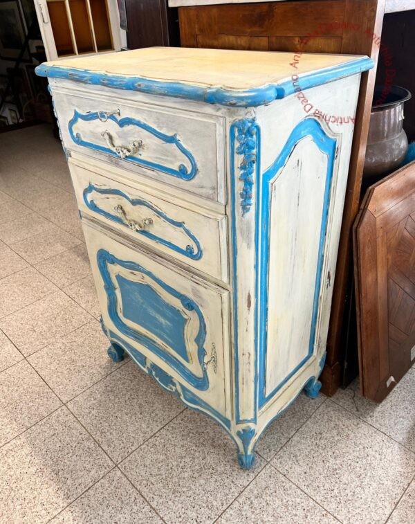 La finitura azzurro e crema decapata, aggiunta successivamente, in stile shabby chic.