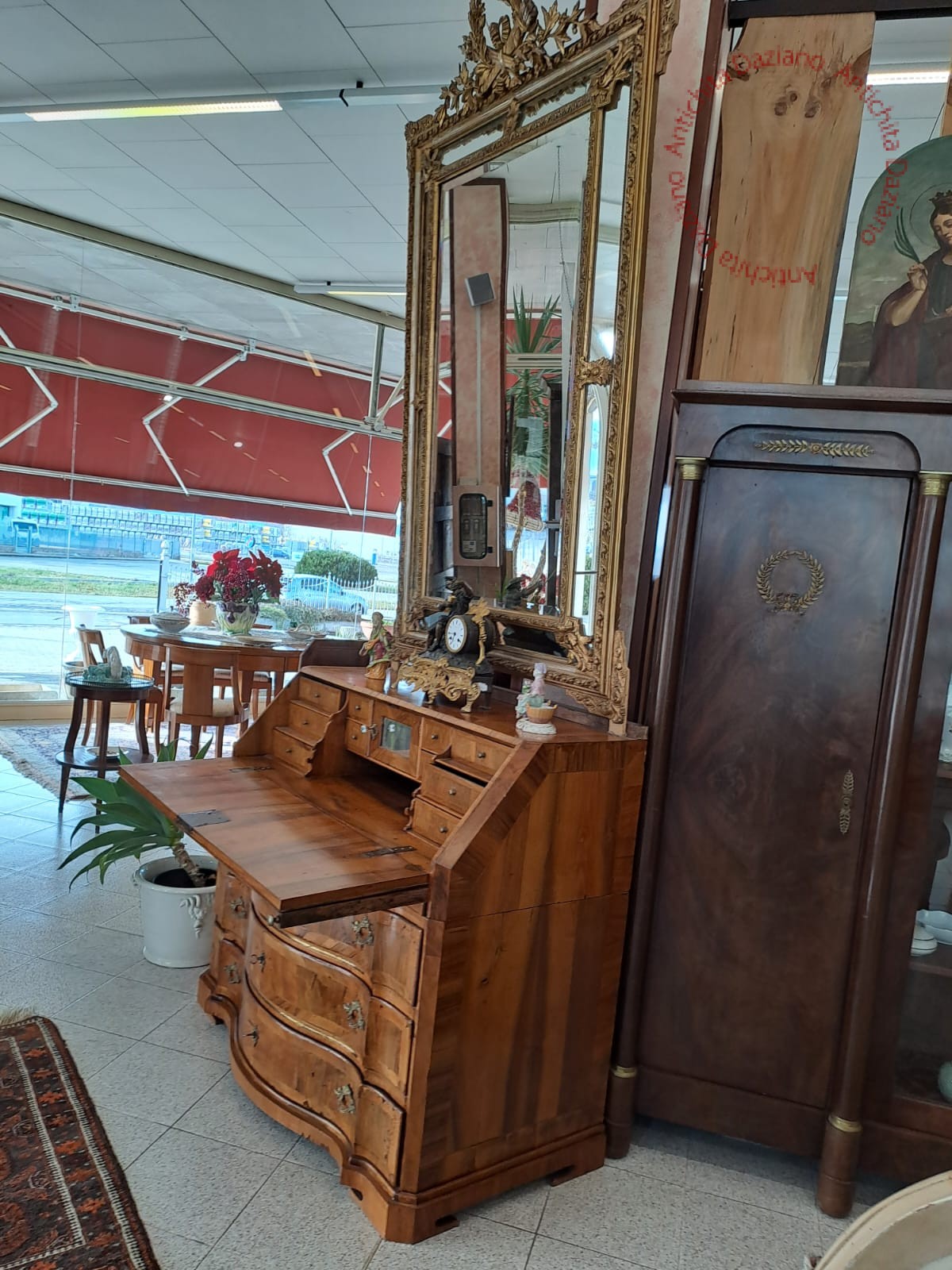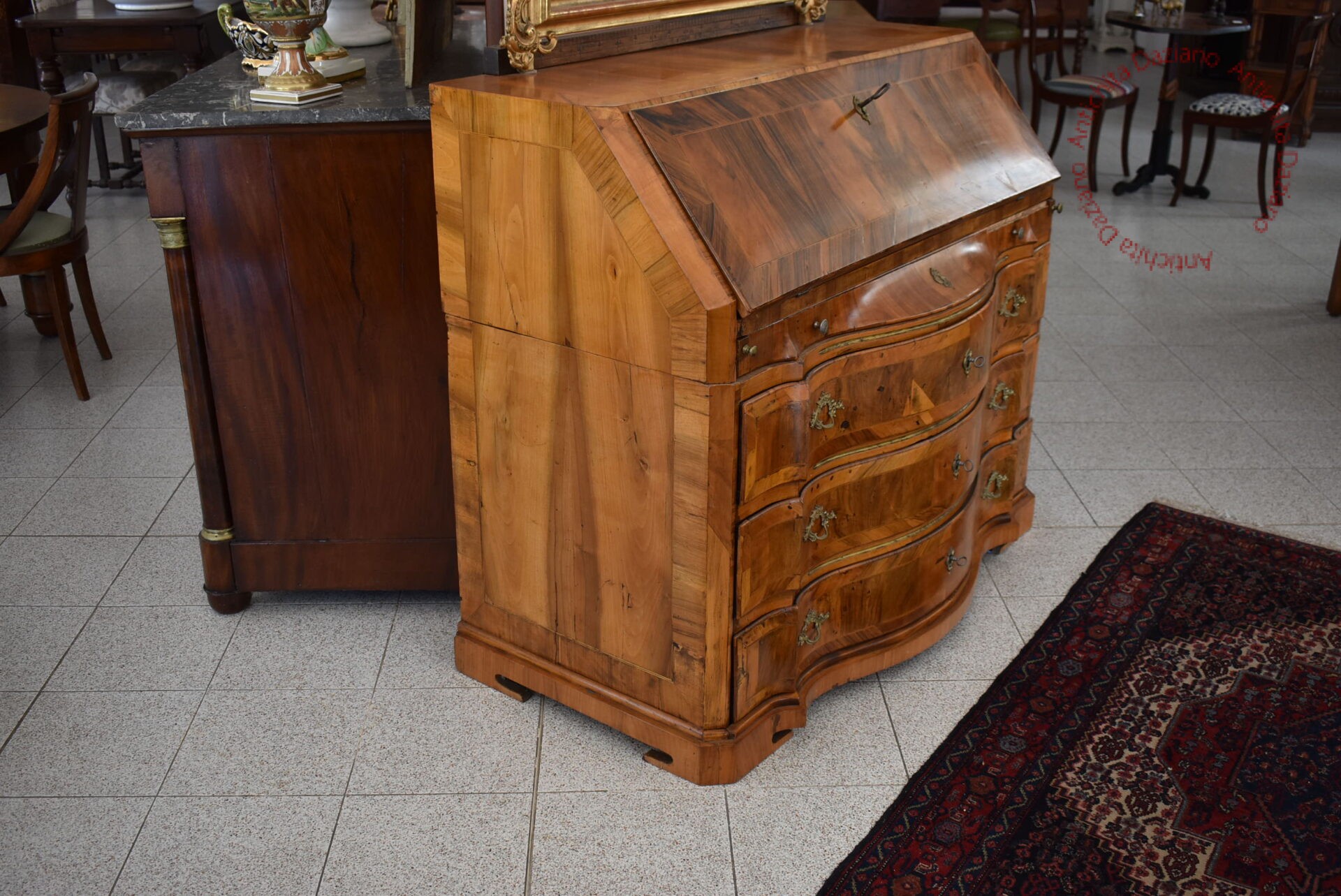 All’interno, dietro la ribalta, sono presenti piccoli cassetti e un’antina a specchio, ideali per custodire documenti, e oggetti personali.