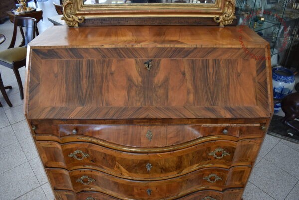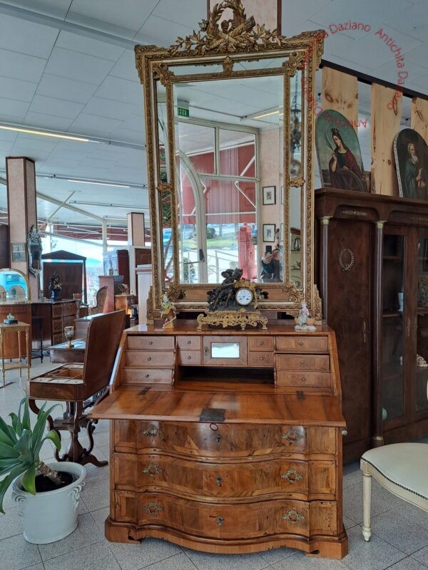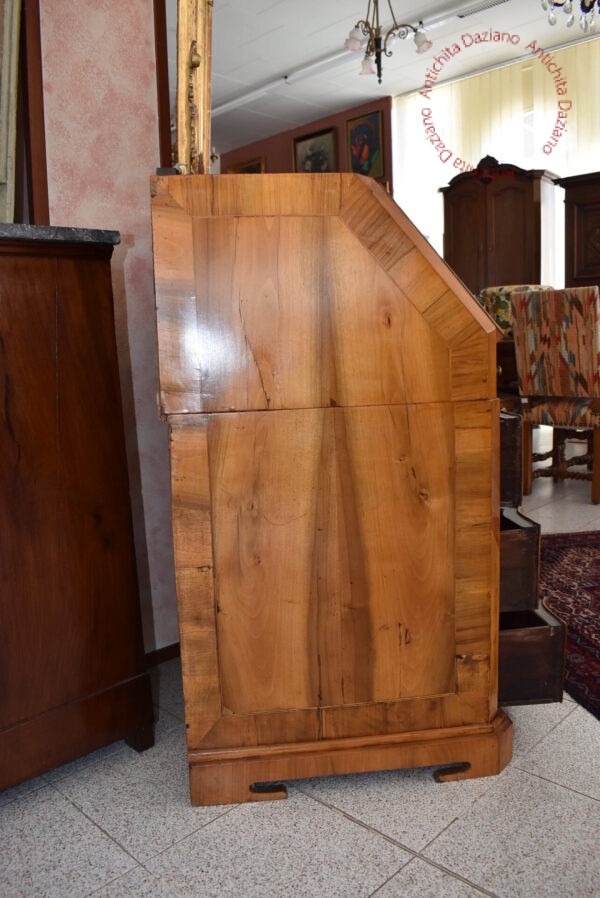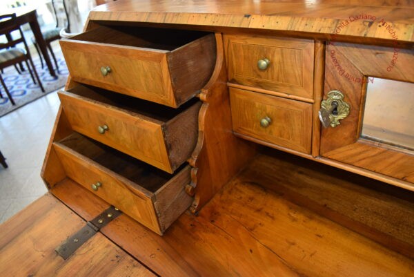 All’interno, dietro la ribalta, sono presenti piccoli cassetti e un’antina a specchio, ideali per custodire documenti, e oggetti personali.