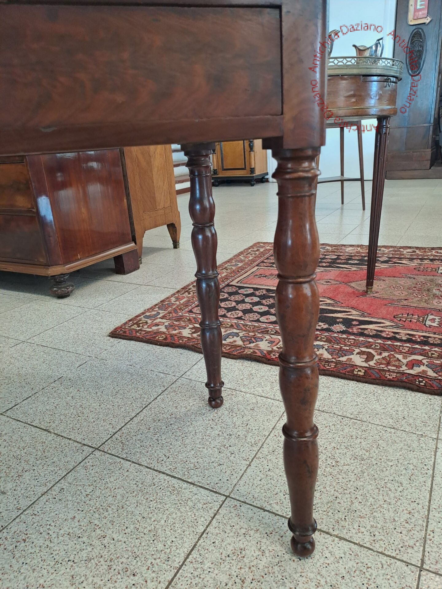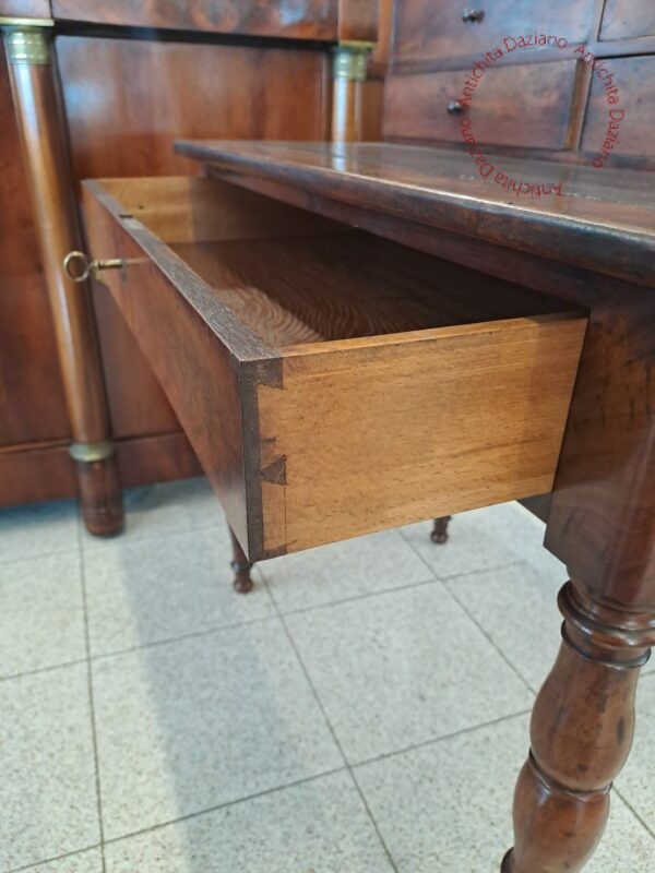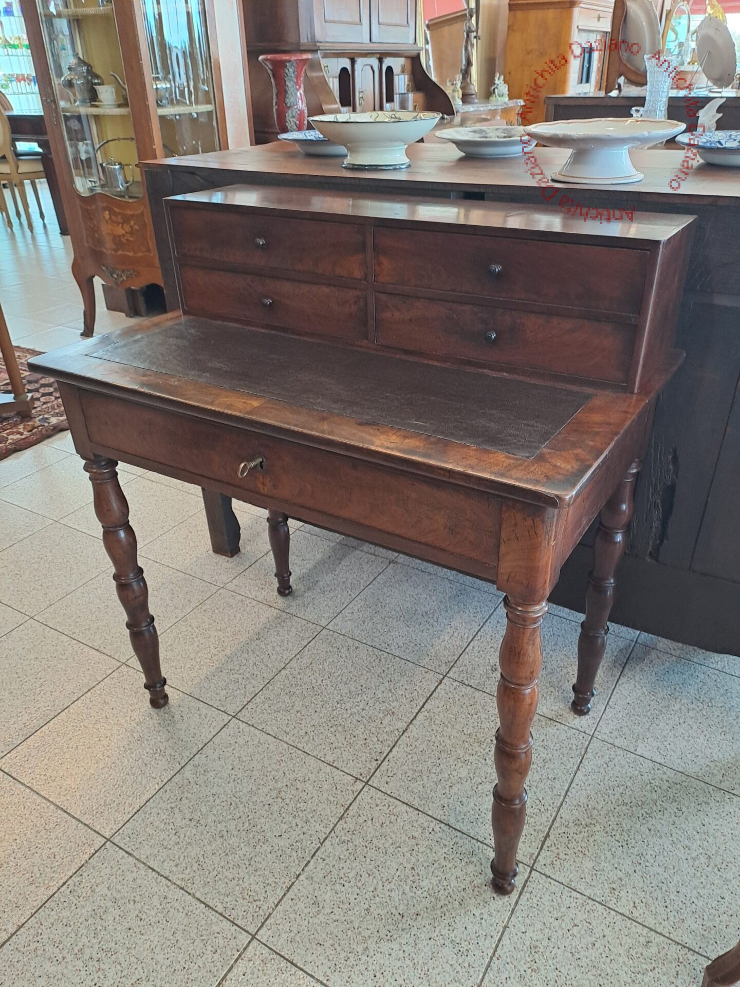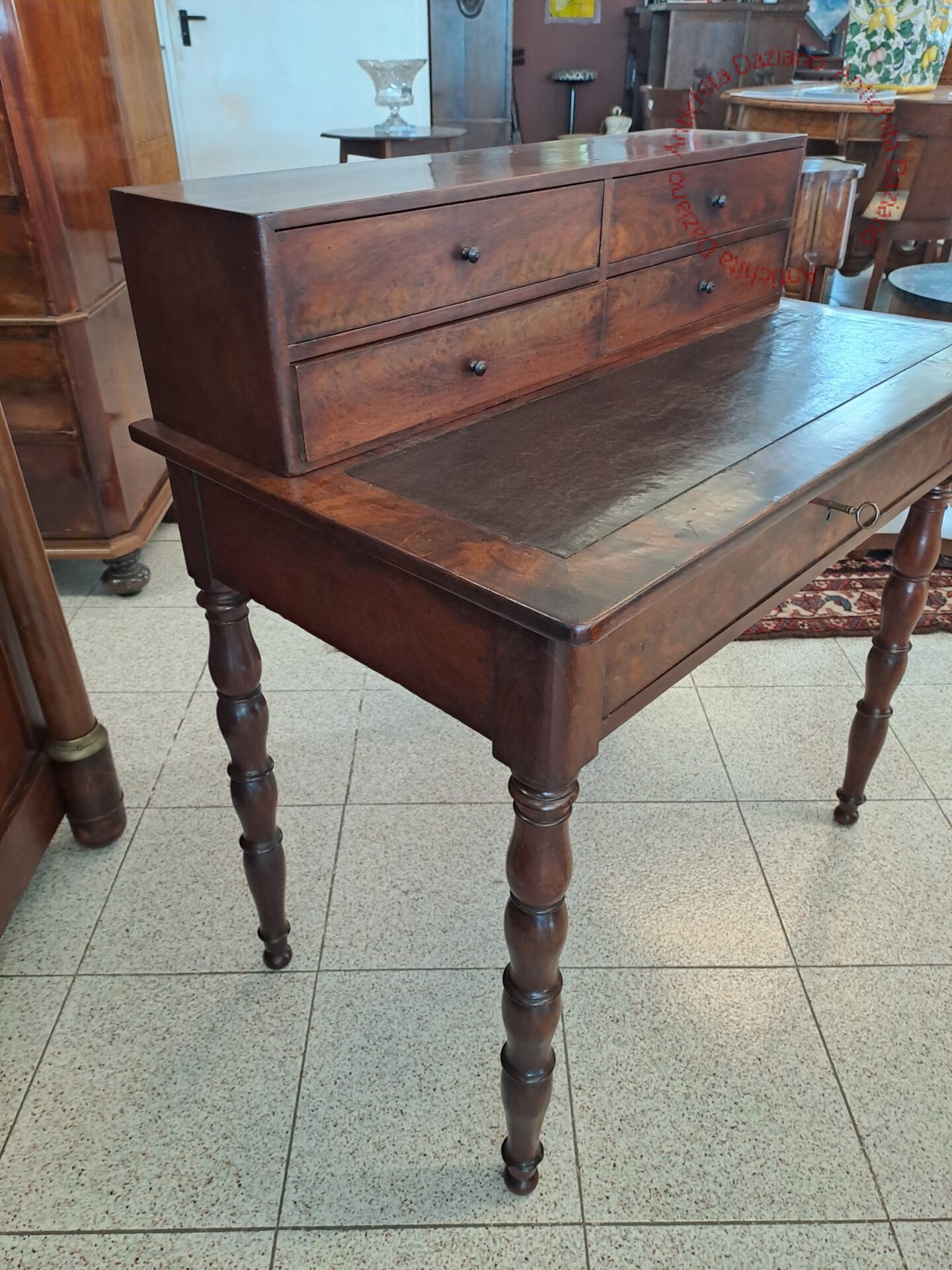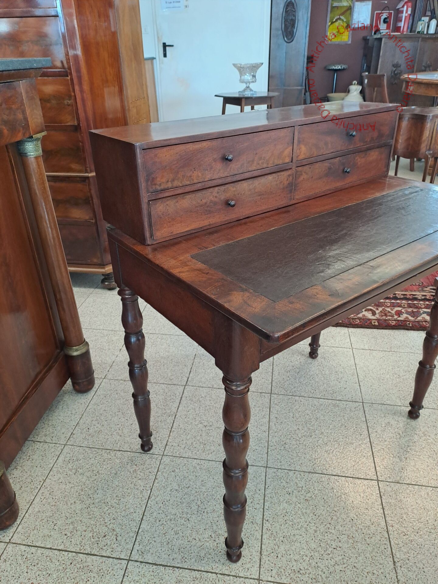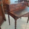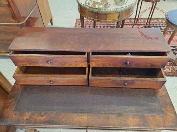 in piuma di mogano con pelle originale, provenienza francese, gambe tornite piano scrittura estraibile .