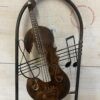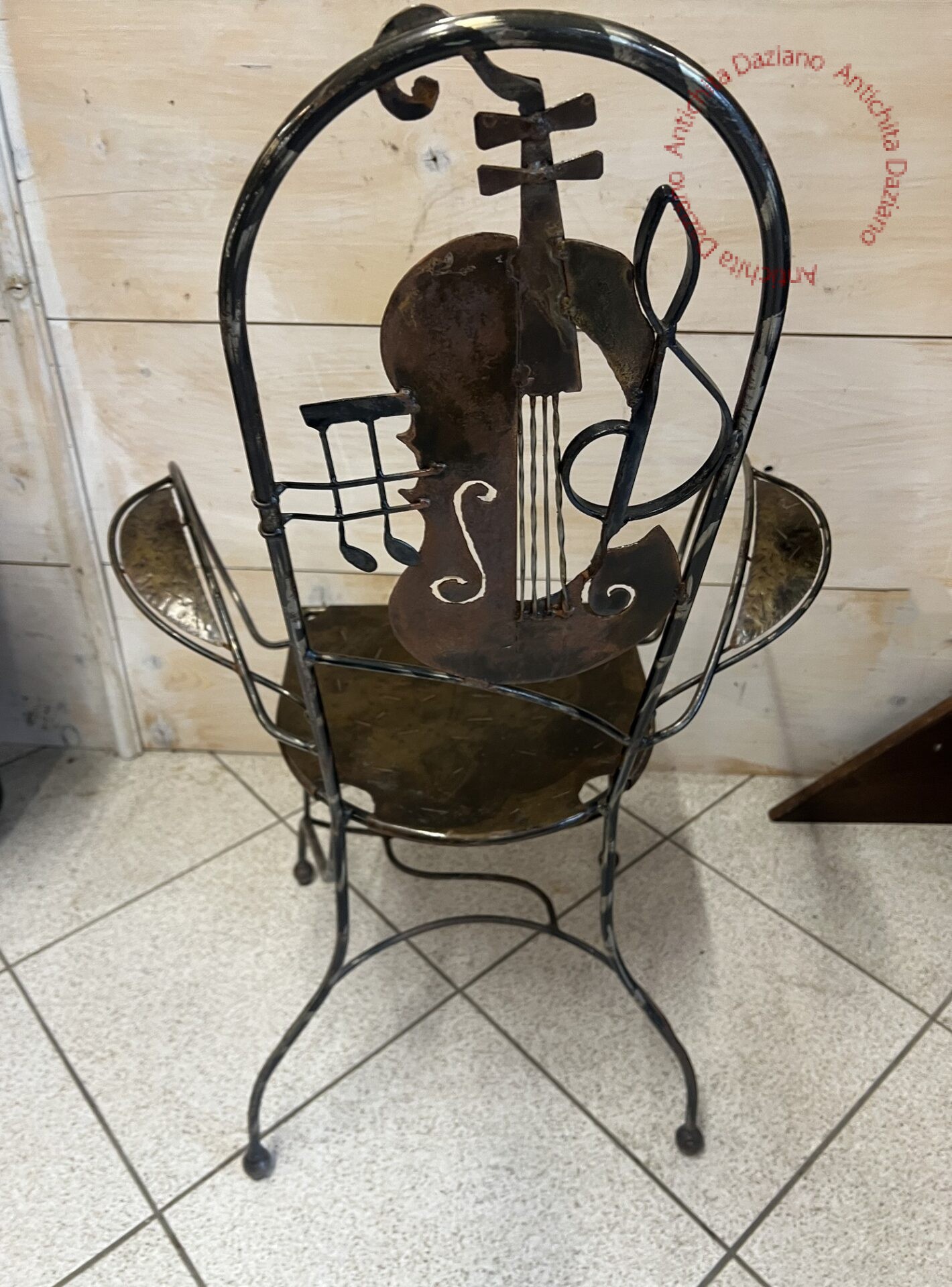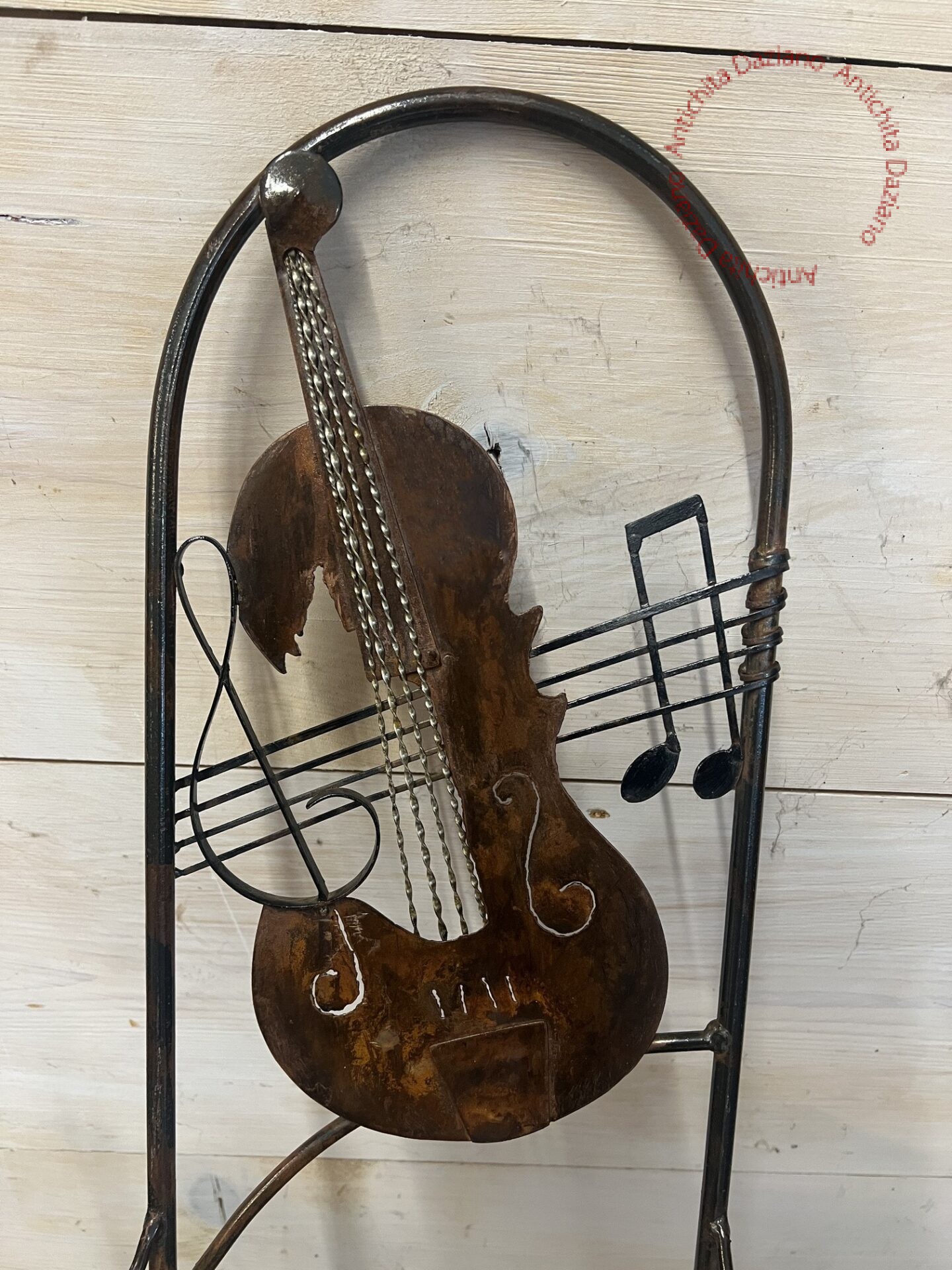 Opera unica realizzata artigianalmente, questa sedia in ferro unisce funzionalità e arte. Lo schienale è impreziosito da un raffinato violino. Sedia in ferro con braccioli.