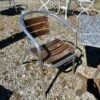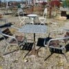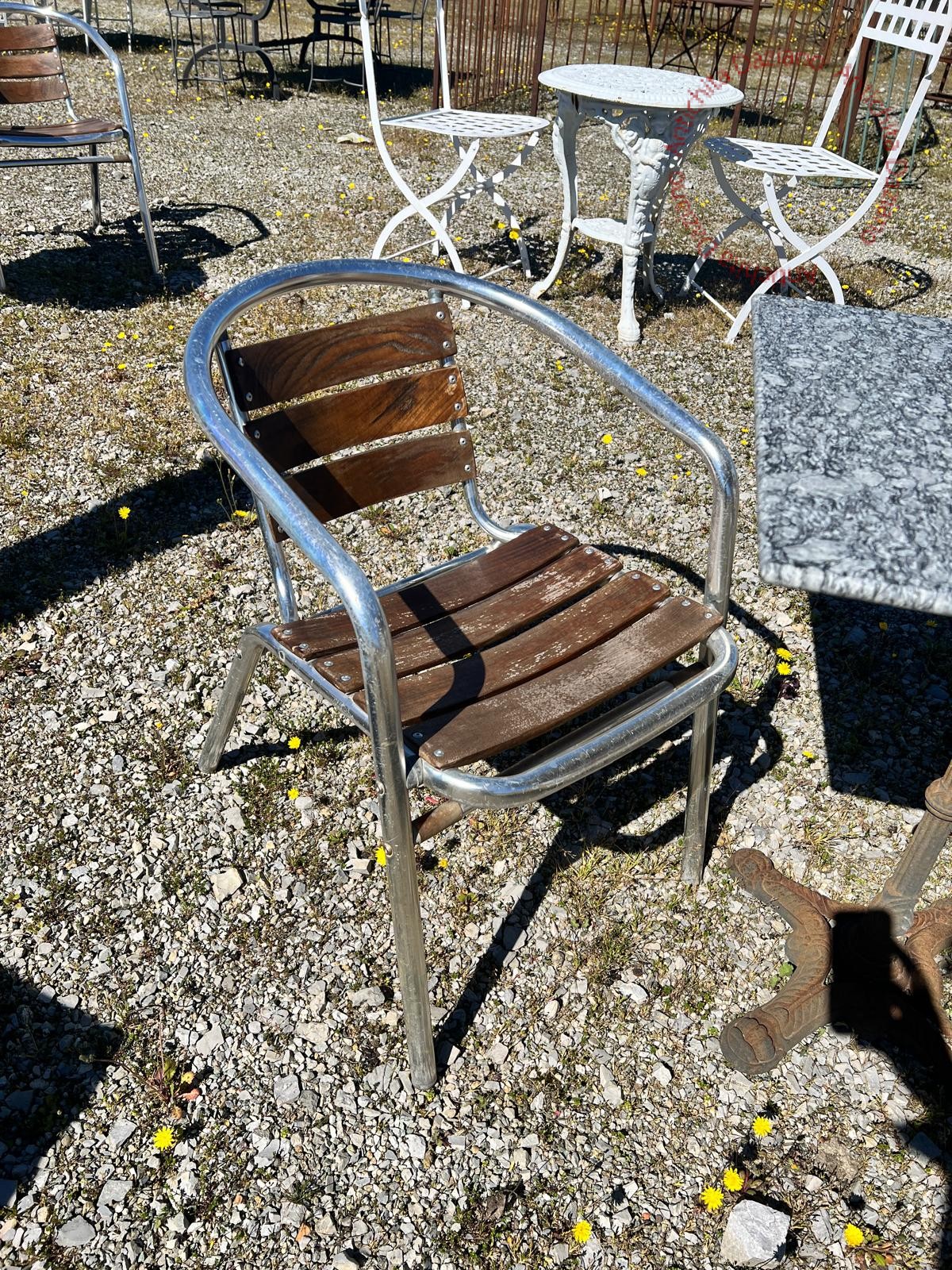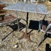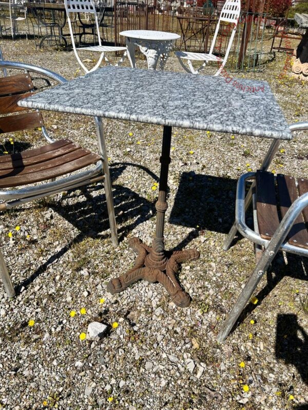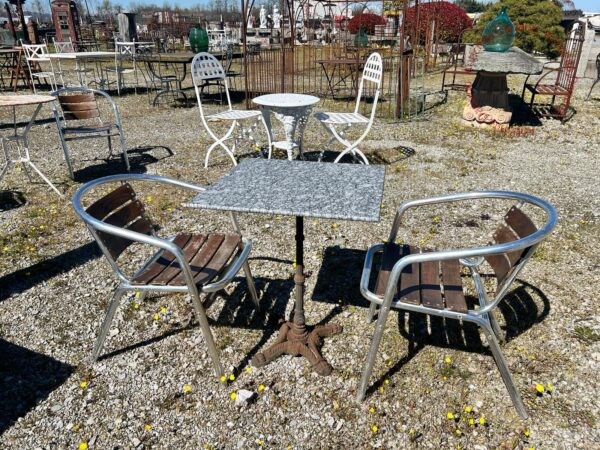 Tavolo bistrot con base in ghisa e piano in marmo, sedie realizzate in alluminio, con stecche in legno.