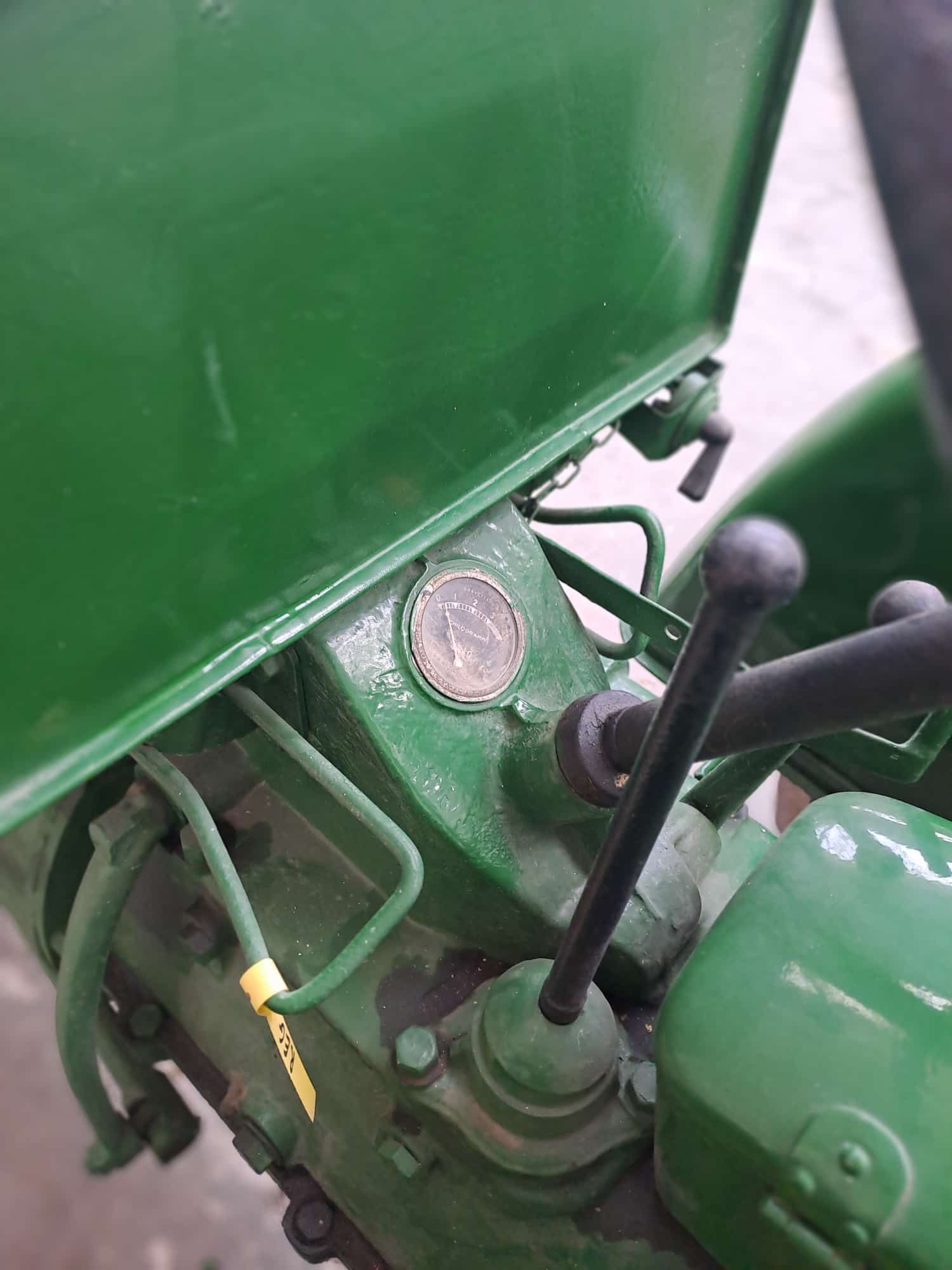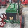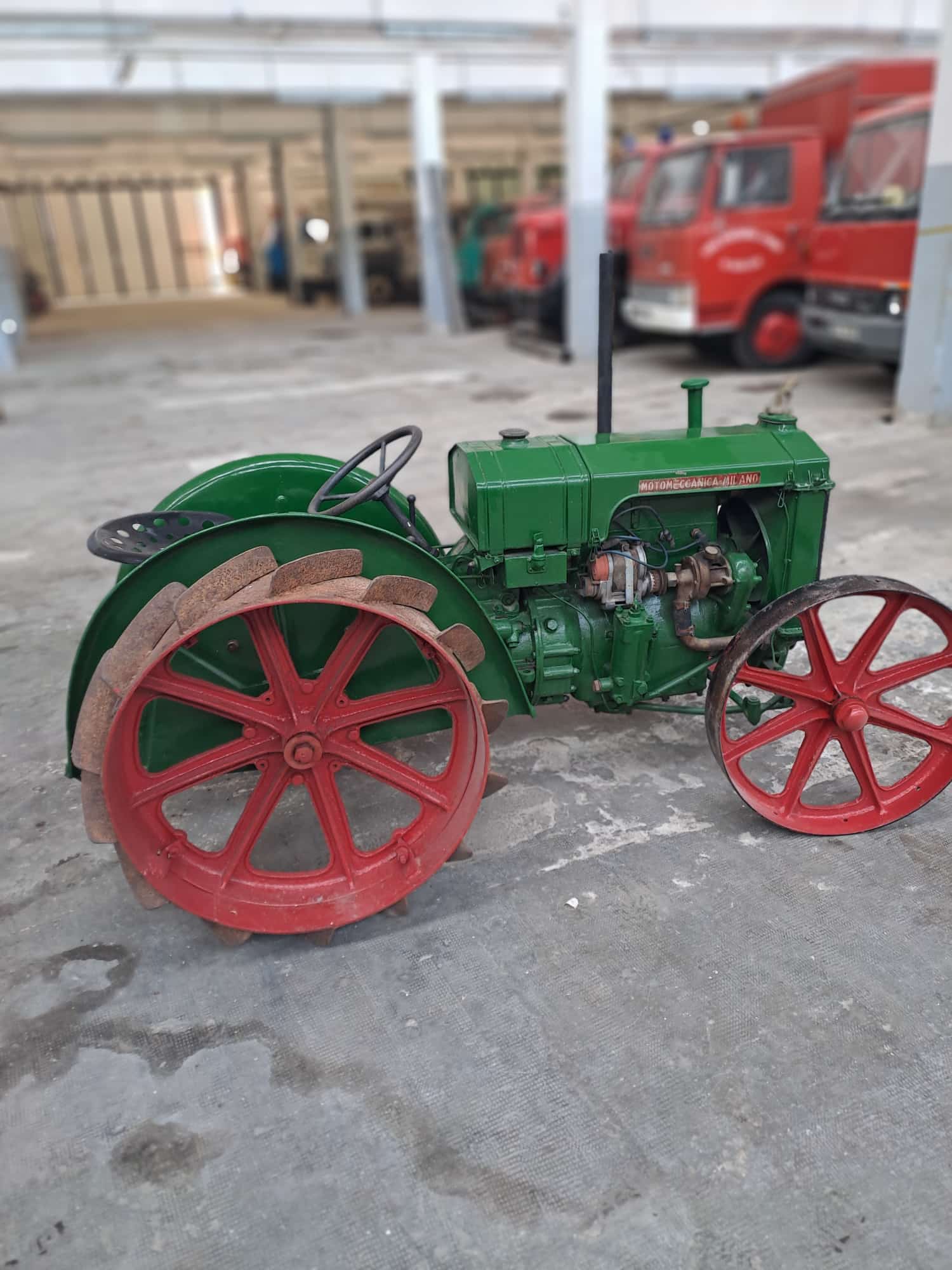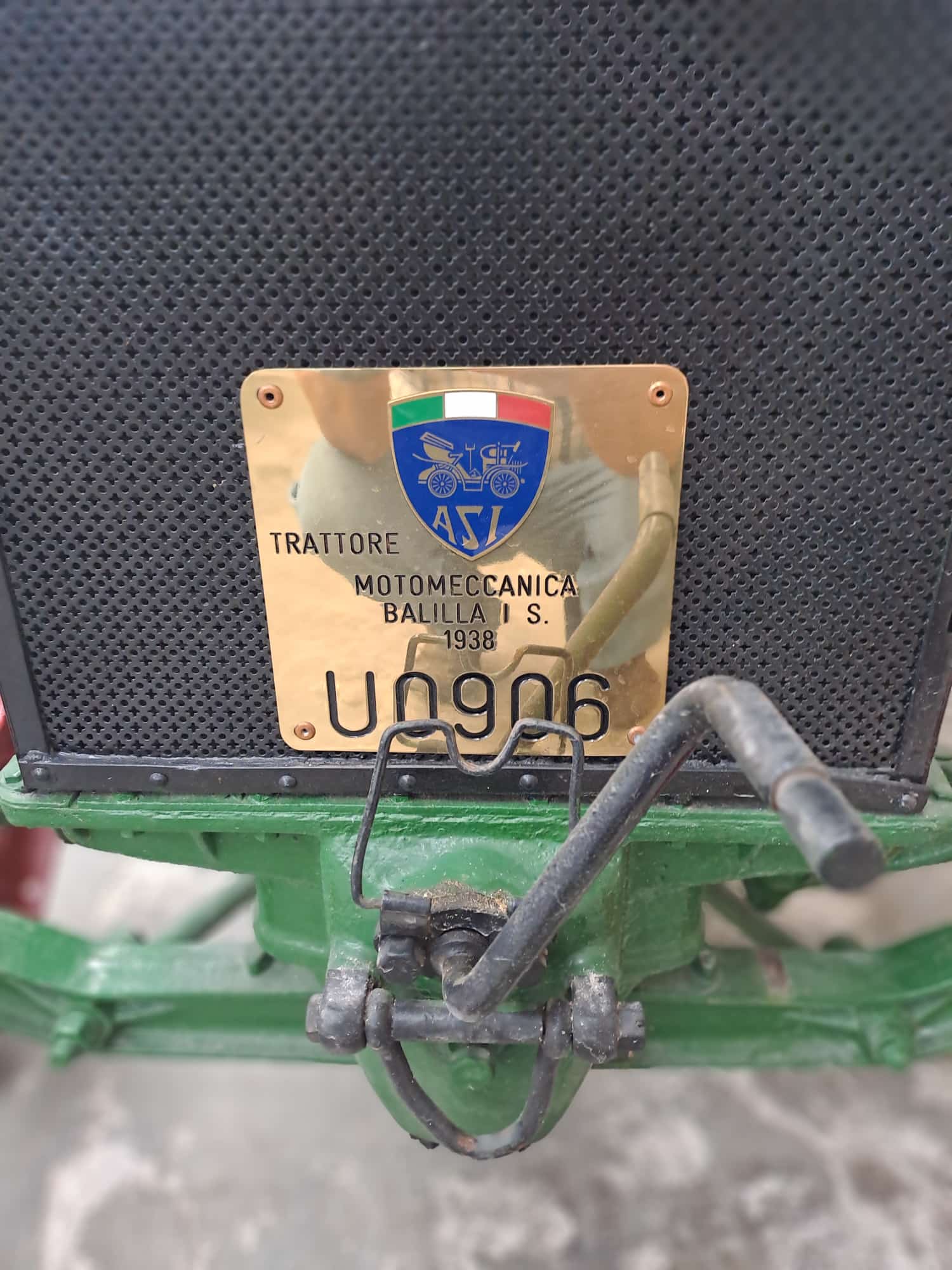 Trattore Balilla, 1ª Serie, Targa oro, anno 1938, ruote in ferro anteriori e posteriori dotate di palette (dette anche gabbie metalliche o ramponi) — un tipo di ruota tipico dei trattori agricoli d’epoca, pensato per aumentare la trazione su terreni fangosi o arati.